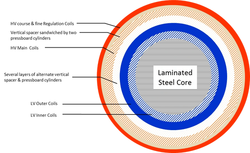 In a typical oil-filled transformer, each of the three phase windings has four layers of winding coils: two are low-voltage (LV) comprising an inner and an outer coil, and two are high‑voltage (HV) comprising a main and a coarse regulation (CR) / fine regulation (FR) coil. Each of the coils comprises many turns of copper conductors that is wrapped with paper insulation. The LV coils are housed concentrically within the HV coils and wound onto a laminated sheet steel core.